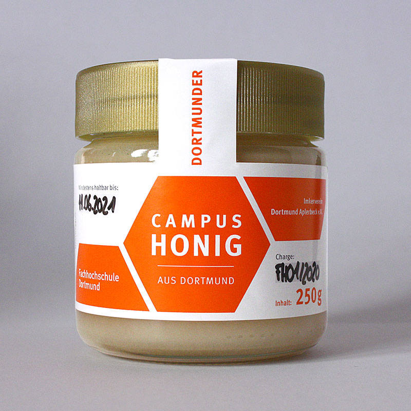 Du stehst auf natürlich, gesund und regional … Dann ist unser Campus-Honig genau das Richtige. 250 g bester Honig produziert von unter unserer Patenschaft stehenden fleißigen Dortmunder Bienen des Imkervereins Dortmund-Aplerbeck. Campus-Honig heißt nicht nur so, sondern ist auch genau das, denn unsere fleißigen Produzenten – zwei Bienenvölker – sind am Campus Emil-Figge-Straße beheimatet. Mehr regional geht kaum…
