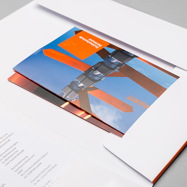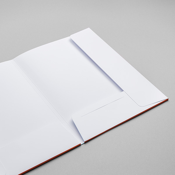 Die doppelseitige DIN-A4 Mappe eignet sich besonders zum Versenden von Anschreiben mit Flyern. Sie hat eine praktische Lasche zum Einstecken einer Visitenkarte.