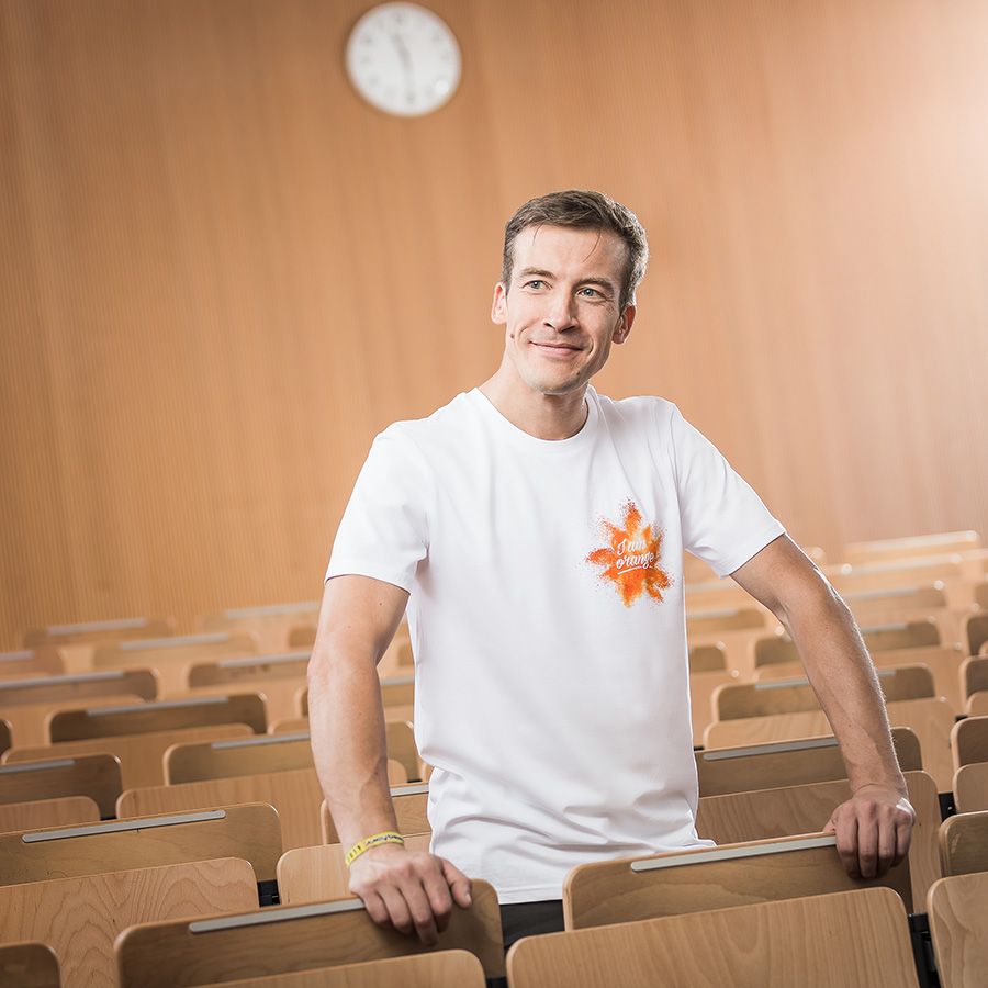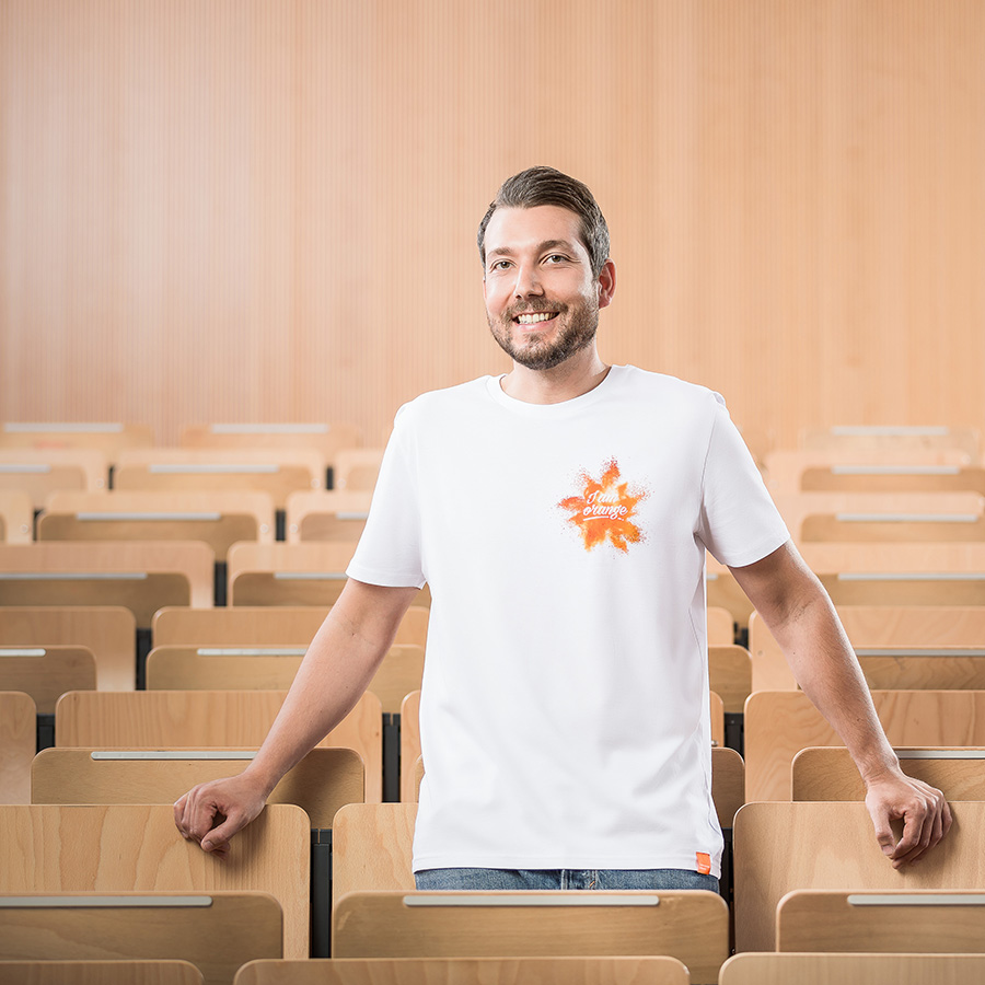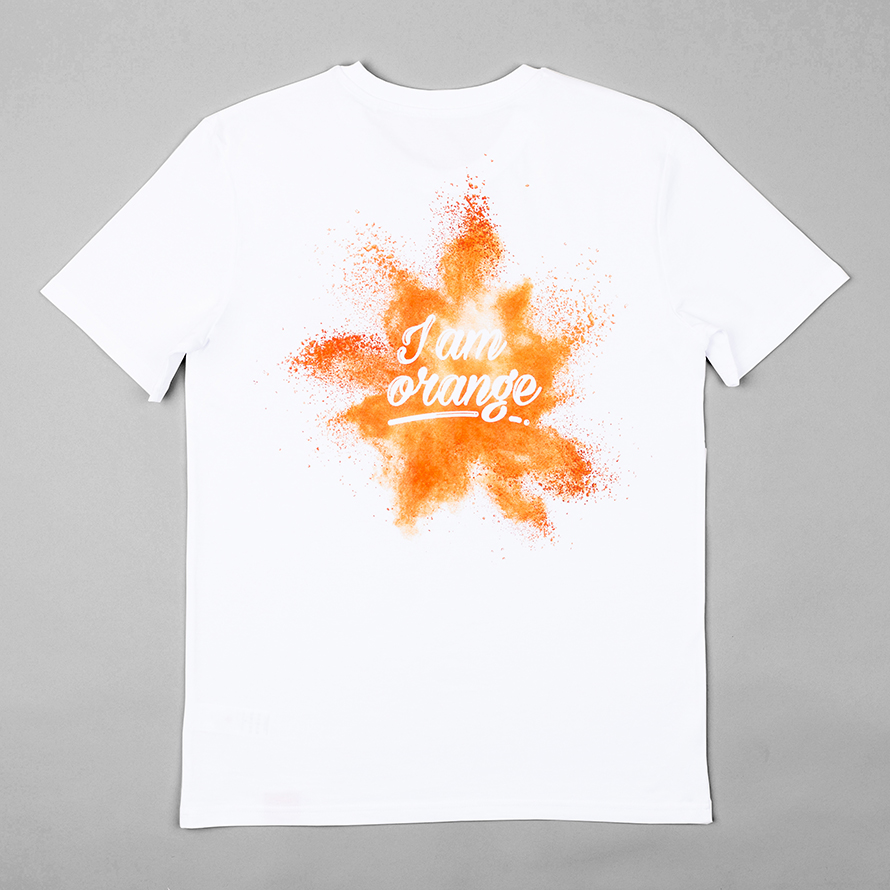Weißes, enganliegendes T-Shirt mit Rundhalsausschnitt. Mit „I am orange“-Aufdruck auf Vorder- und Rückseite. Dezentes FH-Branding durch ein Web-Label am unteren Saum. Für unsere Umwelt: das Shirt ist fairtrade und besteht aus 100% Bio-Baumwolle.