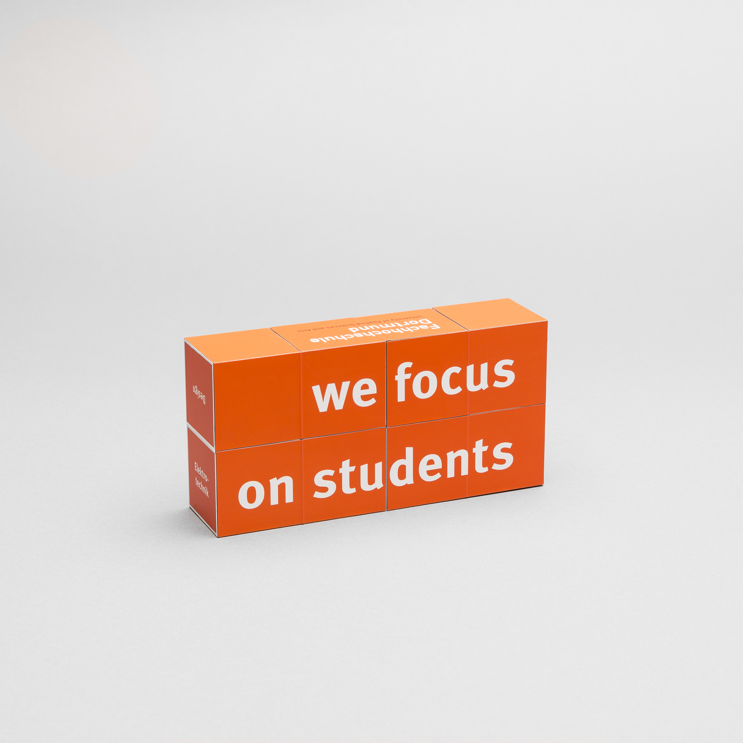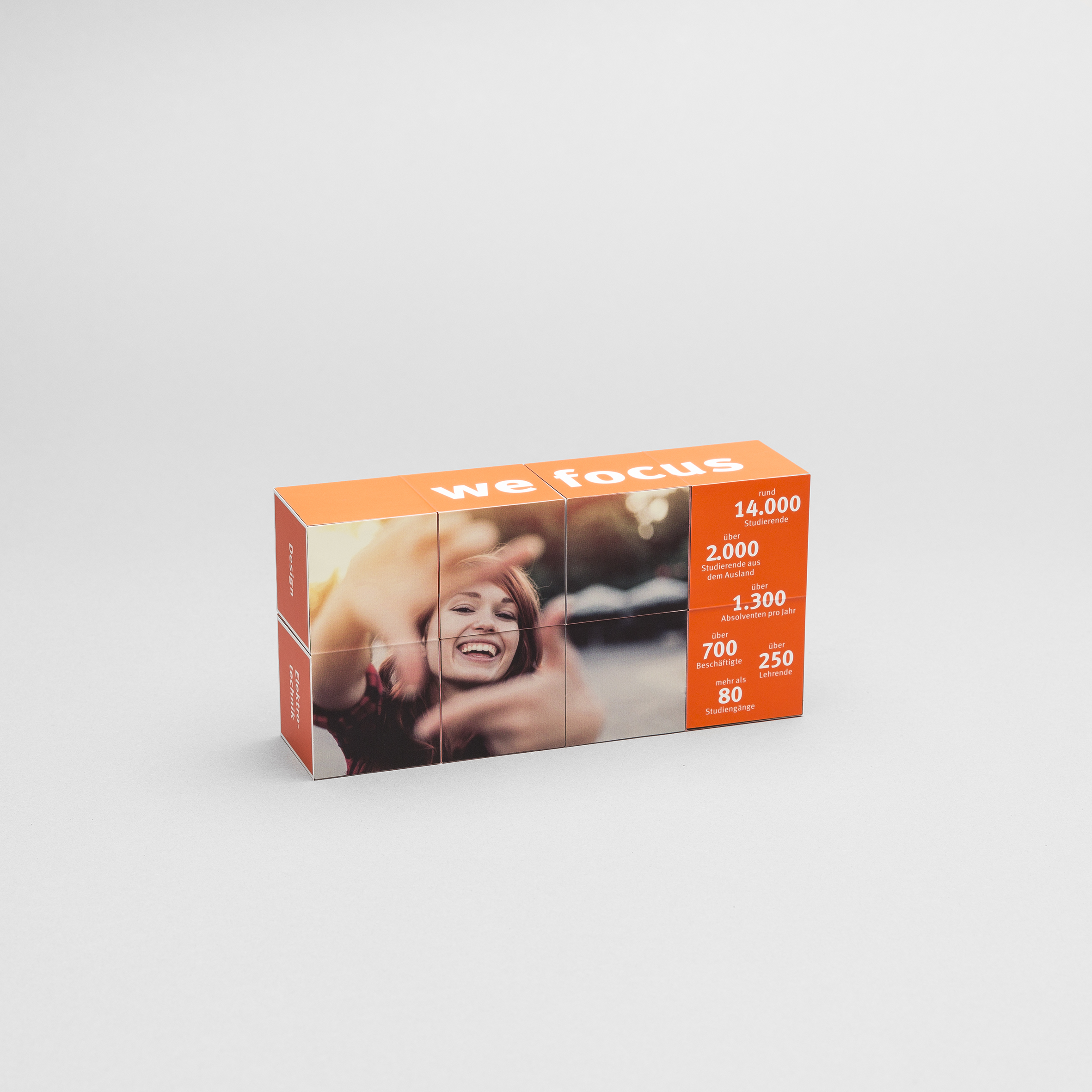 Klipp, klapp! Wenns bei Dir richtig klappt, macht der Slogan Sinn! Kriegst Du es hin? Spielerisch an Informationen kommen, durch Falten, Klappen und Drehen. Idealer Merchandiseartikel mit Informationen zur Fachhochschule Dortmund und zu den Fachbereichen. Der 3D Klappwürfel ist 5 cm hoch und verfügt über einen Magnetmechanismus.